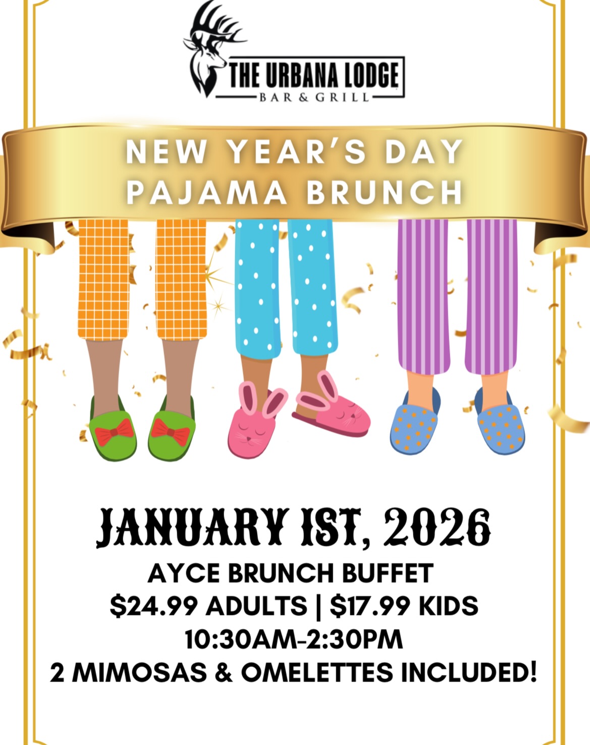 Start the year in comfort at our New Year’s Day Pajama Brunch on January 1st! Roll out of bed and enjoy a cozy brunch without dressing up.