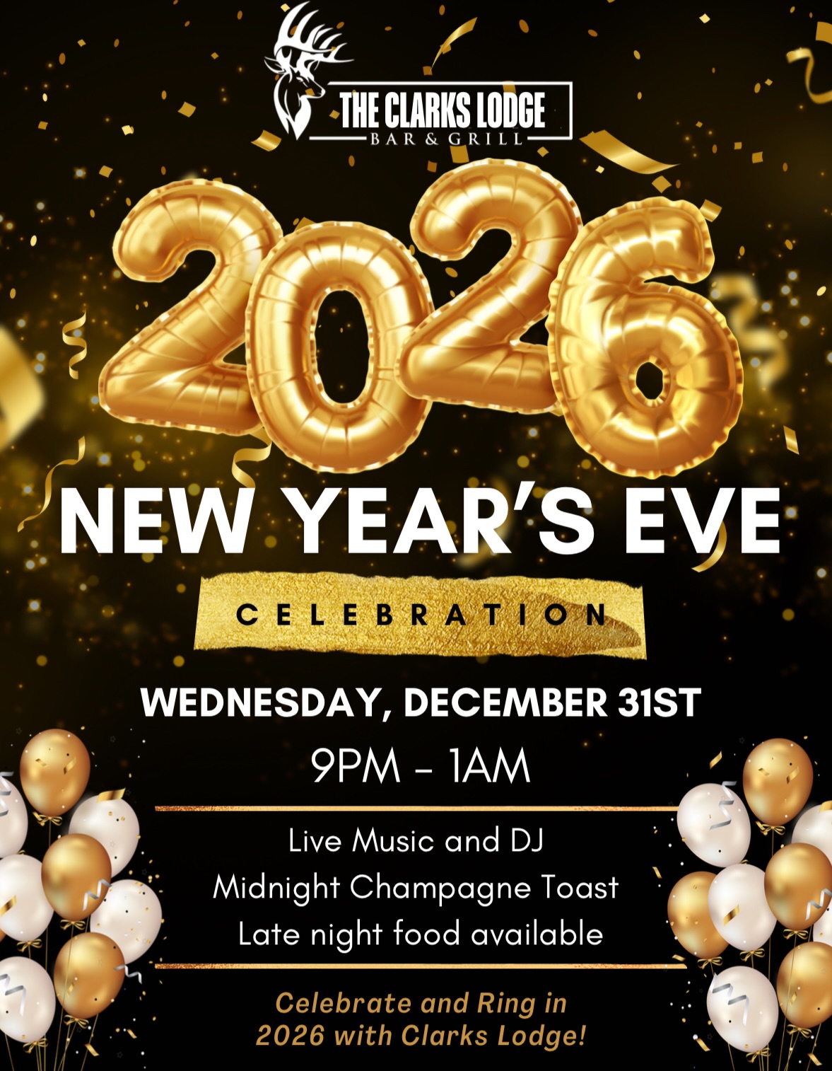 Join us at The Lodge New Year’s Eve for a night of music, dancing and unforgettable memories! Ring in the New Year in style on Wednesday, December 31st starting at 8:00 PM for party favors, live DJ, and midnight champagne toast!